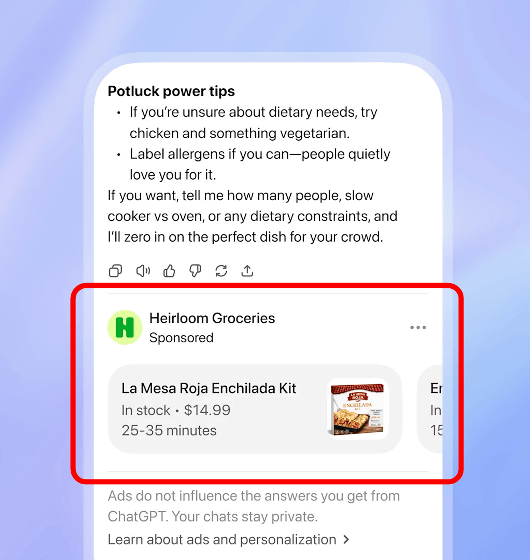 OpenAIは2026年1月に発表ChatGPTでの広告表示すでにアプリに広告関連のUIを追加しているなど。準備が進んでいます私はそこにいた。 ChatGPTでの広告表示テストがついに正式に始まりました。