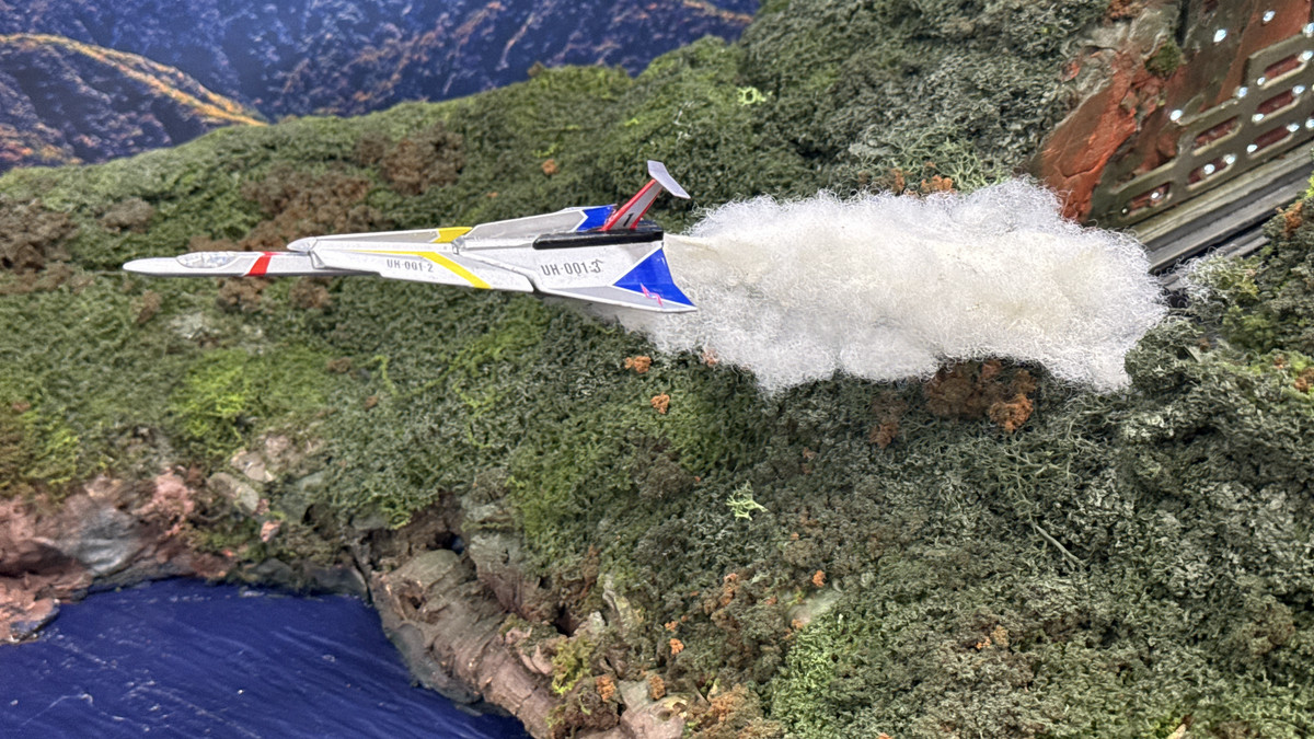 山の開閉部から白煙を発するウルトラホーク1号。