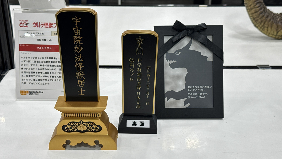 会場の笑いを誘ったのは、初代『ウルトラマン』第35話「怪獣墓場」で特捜隊が基地で慰霊祭を行った際に登場した位牌だ。写真欄には「お好きなモンスターの写真を入れてください」と書かれている『よろず天然堂』。生来の素人さんの作品です。