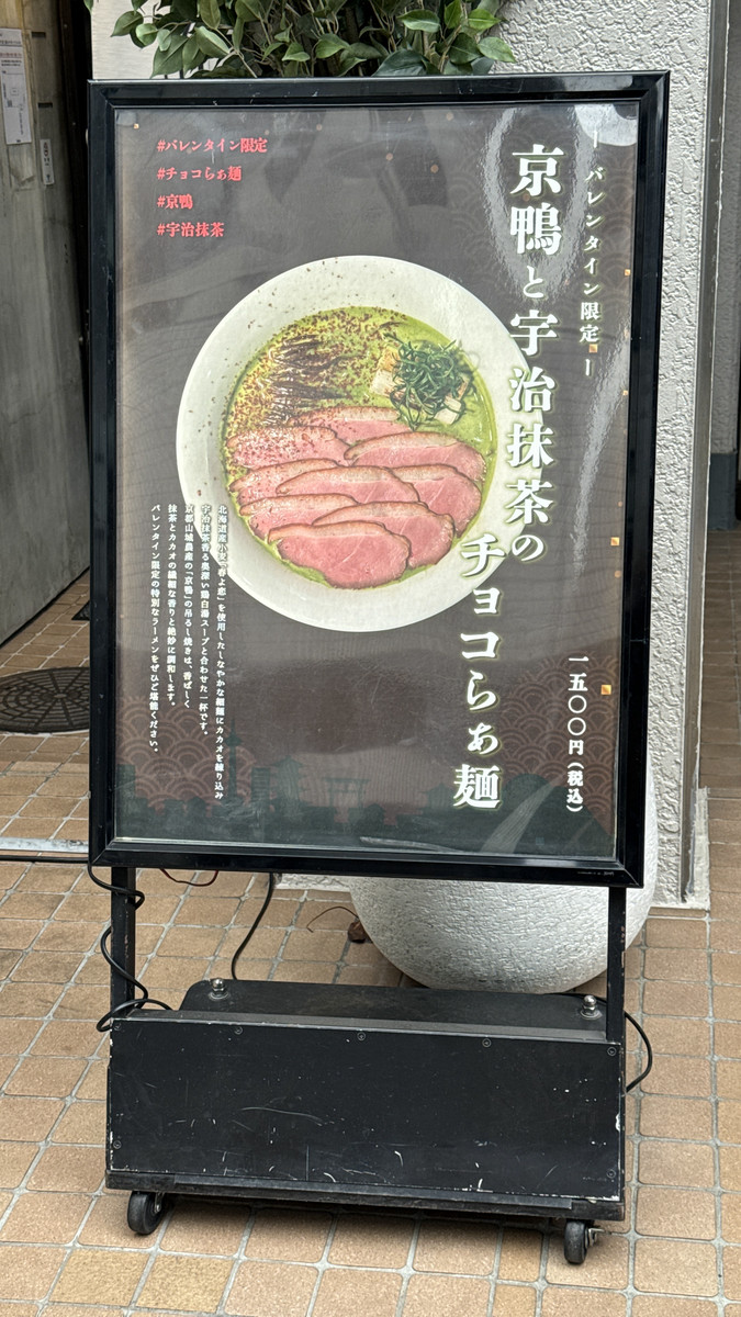 店頭には「京鴨と宇治抹茶のチョコレートラーメン」のポスターが貼られていました。
