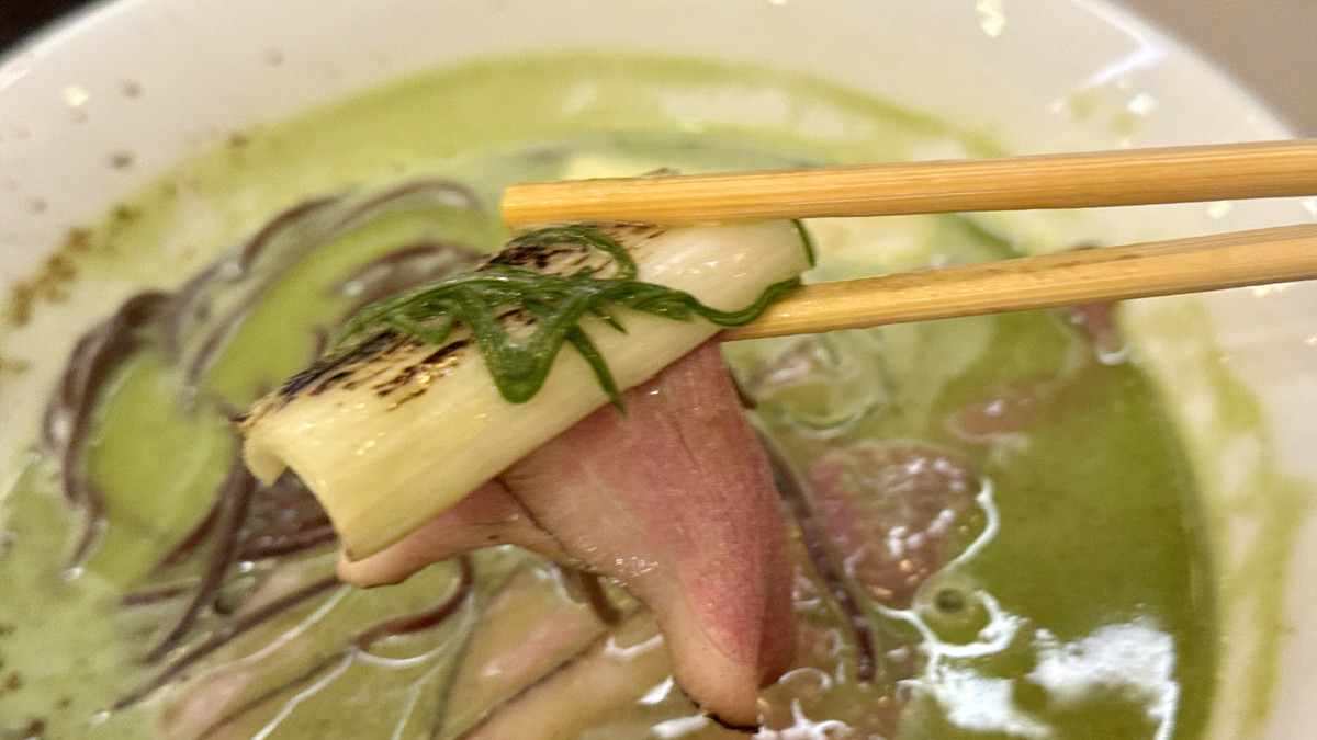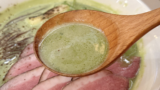 まずはスープを飲んでみます。ベースは鶏白湯で、鶏の旨味がしっかりと感じられ、抹茶の香りとほのかな苦みが感じられます。この苦みのおかげで鶏白湯スープの甘みが引き立ちます。抹茶の香りがスープの香りを邪魔することなく絶妙にブレンドされているように感じました。