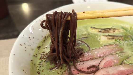 カカオを練り込んだ麺は、エッジの効いたしなやかな食感。ほんのりカカオの香りがしますが、甘さはなく小麦の香りもあり、抹茶鶏白湯スープとよく合います。