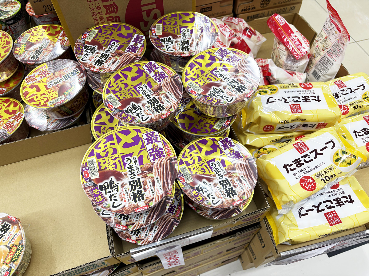スーパーで日清の最強のどん兵衛鴨だしそばを見つけました。金と紫の配色が目印です。