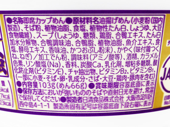 原材料を見てみると、鴨エキス、鴨調味油、鴨脂、魚介エキス、鰹節粉末といった風味の強い食材がスープに使われていることがわかります。