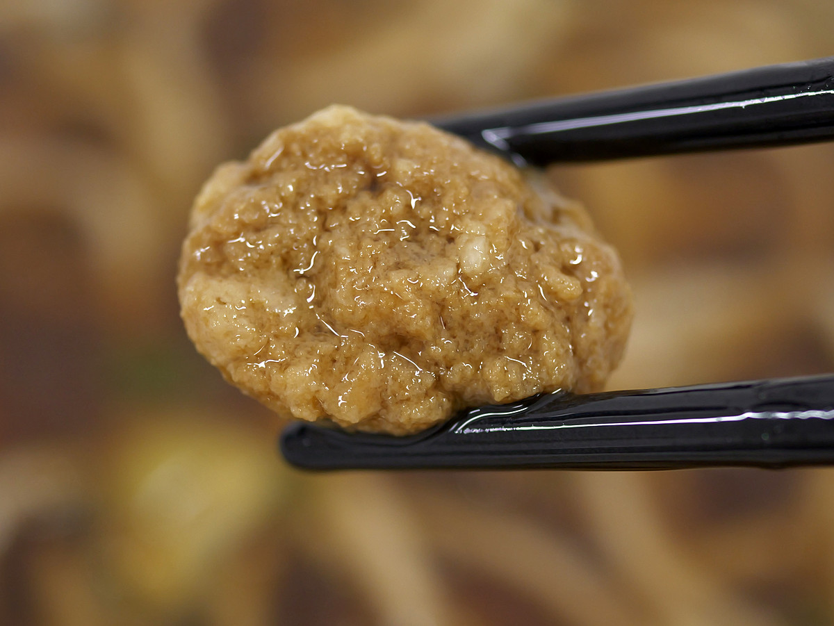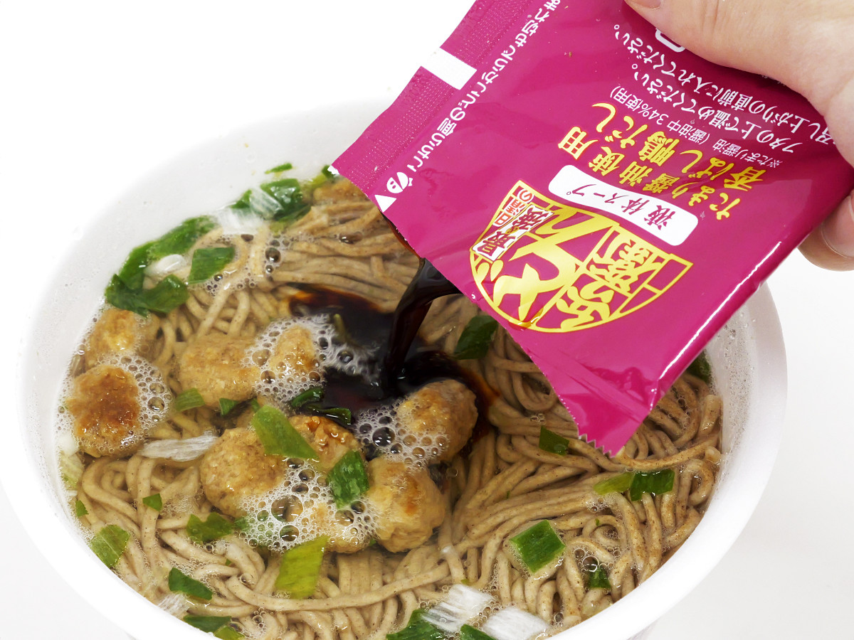 かやくは「味付鶏つくね」と「ねぎ」の2種類で、つくねは通常の日清のどん兵衛鴨だしそばより大きい。