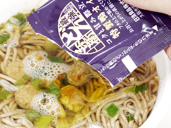 熱湯を注ぎ、蓋の上で油とだし汁を温めながら5分待ちます。