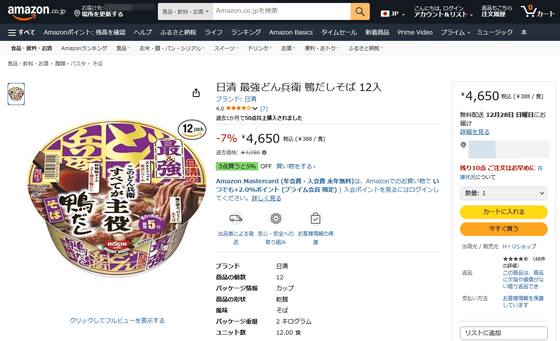 日清の最強どん兵衛鴨だしそばの希望小売価格は税抜280円、Amazon.co.jpでは12食入りセットが税込4650円(1食あたり388円)で販売されています。西京どん兵衛シリーズは大晦日には売り切れてしまうことが多いので、年越しそばとして食べたい場合は早めに入手することをおすすめします。