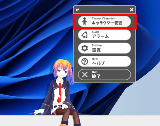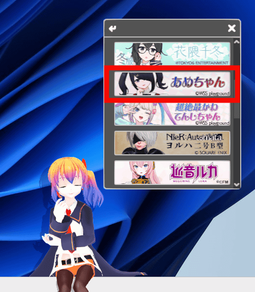「Desktop Mate」は無料アプリで、「アメちゃん」「超絶才川天使ちゃん」は有料DLCとして配信されています。 DLC購入後、Desktop Mateを起動し、初期キャラクターを選択します。あえるたん右クリックして「文字変更」をクリックします。