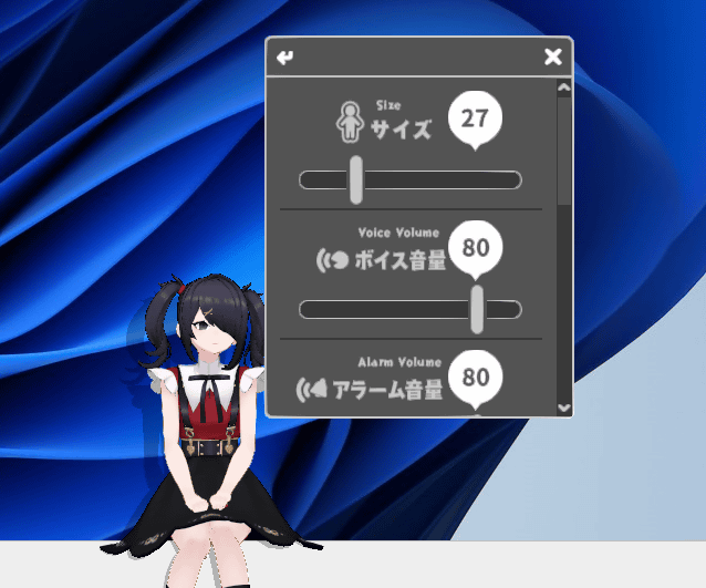 右クリックメニューから「設定」を選択するか、キャラクターにカーソルを合わせて上下にスクロールすると、1~100まで100段階でサイズを調整できます。