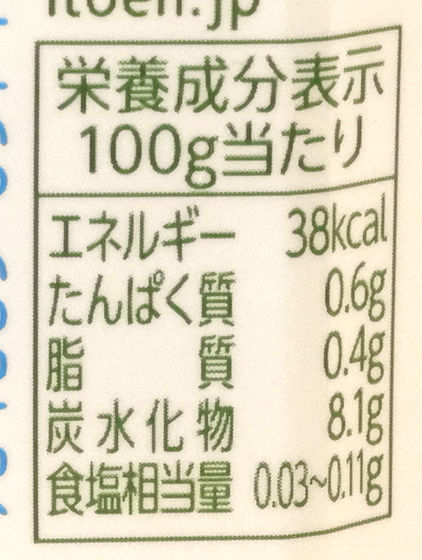 カロリーは100gあたり38kcalです。内容量は450g、1本あたり171kcalです。