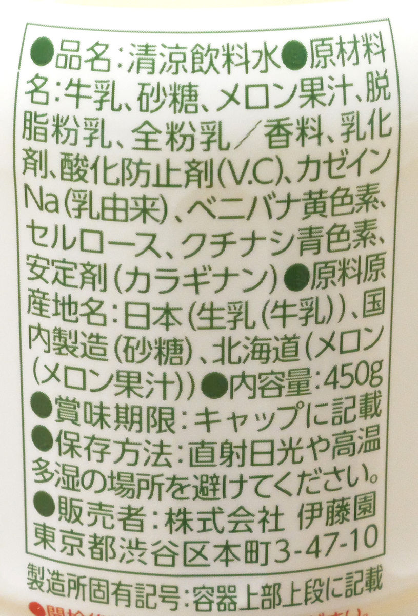 材料は牛乳、砂糖、メロン果汁など。果汁使用率は1%です。