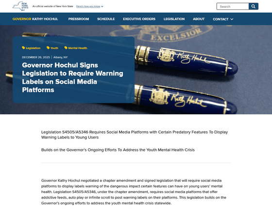 無限スクロール・自動再生などSNSの中毒性のある機能について警告表示を義務化する法案にニューヨーク州知事が署名 - GIGAZINE