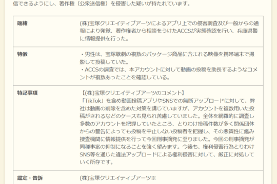 宝塚歌劇の公演映像を権利者に無断でTikTokにアップロード...
