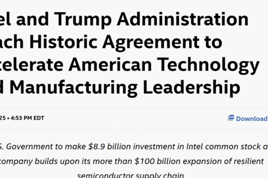 Intelは、米国連邦政府がその持分の約10%を獲得したこと...