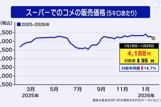 • スーパーのコメ平均価格 5キロ4188円 2週ぶり値下がり