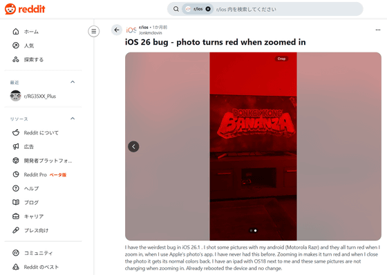 iOS 26 のバグ – ズームインすると写真が赤くなる : r/ios