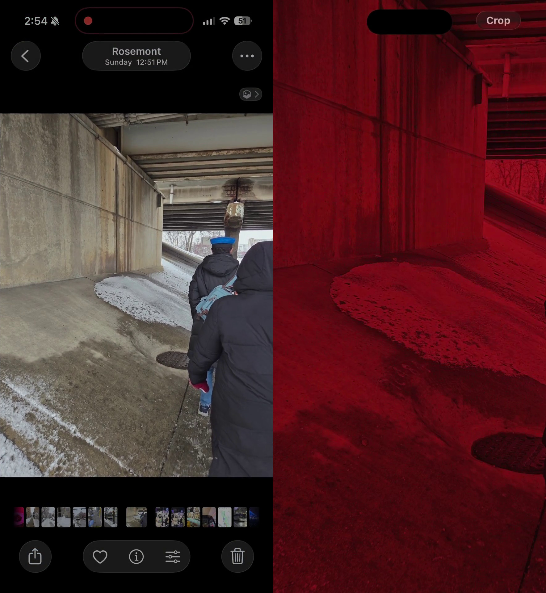サムネイルプレビューでは写真は元の色で表示されますが、写真をタップして拡大すると、赤みがかったフィルターが適用された状態で表示されます。ただし、赤い画像を開いて編集メニューから「元に戻す」をタップするとフィルターが解除されるようです。