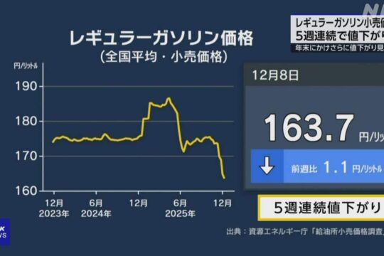 ガソリン価格 5週連...