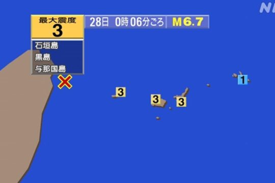 28日午前0時6分ごろ、沖縄県で震度3の揺れを観測する地震が...