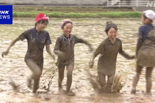 田植え前の田んぼで泥だらけになりながら鬼ごっこやリレーで競い...