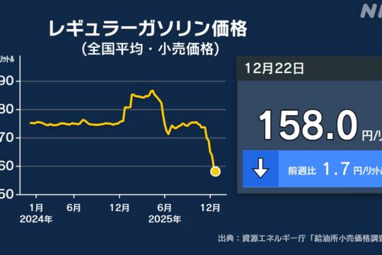 レギュラーガソリンの小売価格は、22日時点の全国平均で1リッ...