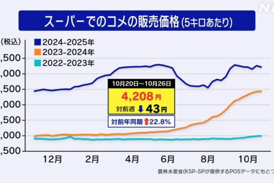 全国のスーパーで10月26日までの1週間に販売されたコメの平...