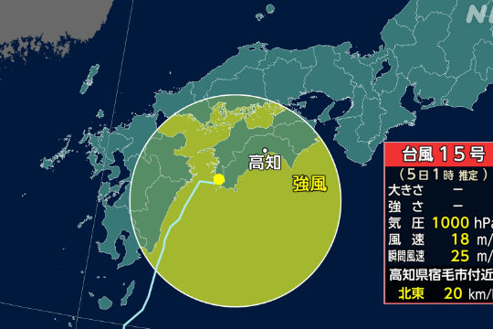 台風15号は、四国にかなり接近していて、このあと上陸するおそ...