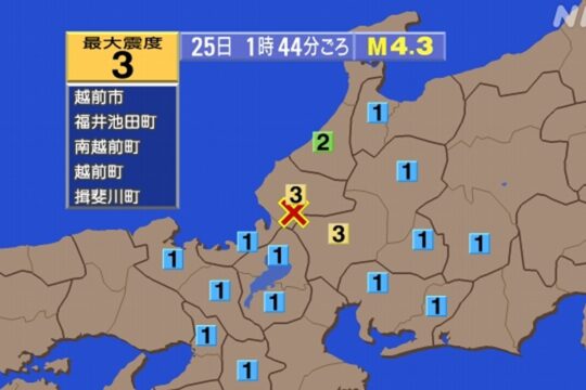 25日午前1時44分ごろ、福井県と岐阜県で震度3の揺れを観測...