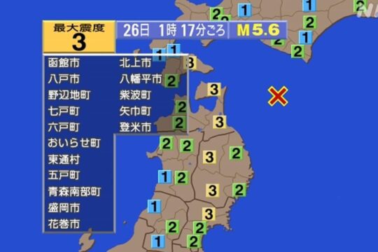 26日午前1時17分ごろ、青森県東方沖を震源とする地震があり...
