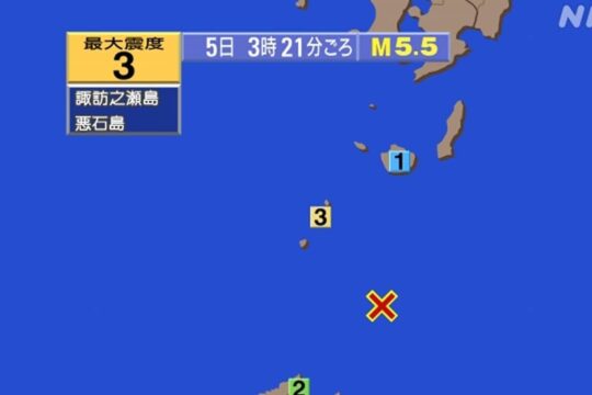 5日午前3時21分ごろ、鹿児島県の十島村で震度3の揺れを観測...
