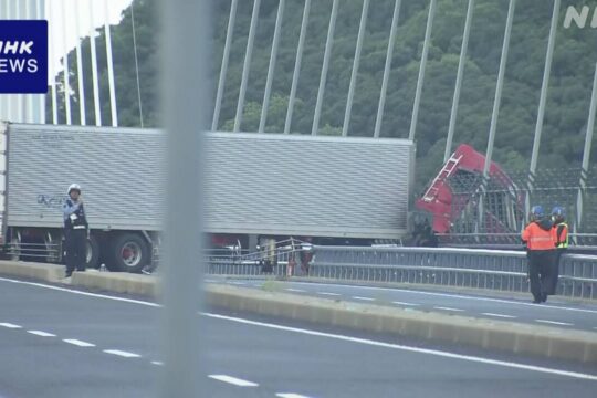 13日未明、長崎市の海にかかる橋の上でトレーラーと乗用車が衝...