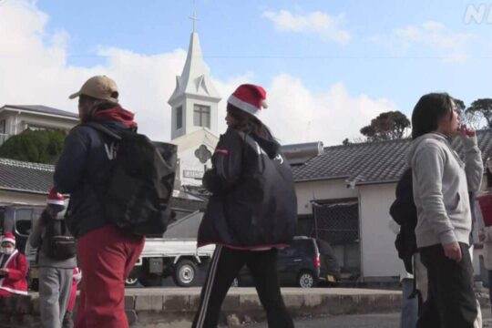 長崎県五島市の奈留島で、サンタクロースの衣装を着て、世界文化...