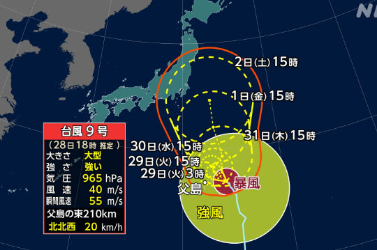 大型で強い台風9号は強い勢力を維持したまま、29日にかけて小...