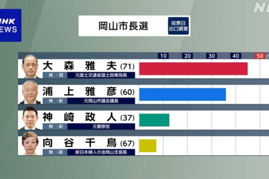 現職と新人の4人の争いとなった岡山市長選挙は、現職の大森雅夫...