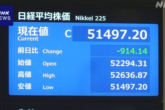 連休明けの4日の東京株式市場、日経平均株価は、一時、5万26...